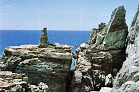 五六島はその名の通り、潮の満ち引きによって島が5つや6つに見える不思議な島です。この一帯は観光船のコースにもなっていますので五六島のすぐ近くまで船で近づくことができます。 |