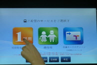 画面の「日本語」を押し、日本語表示にします。次に、画面左の1回用交通カードを押す。