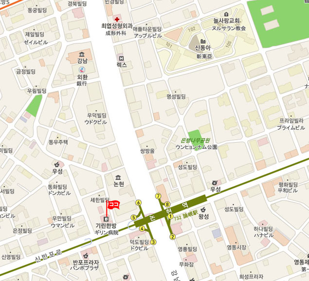 現地 アクセス       地下鉄 7号線の論峴駅(No.732 ノンニョン・Nonhyeon)駅 5番出口から歩いて約 2分所要