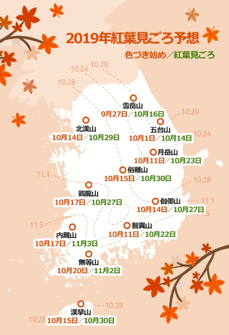 2019年の紅葉の見ごろは、平年並みかやや遅くなる見通しです。 韓国の天気情報サイト「WEATHER i」によると、葉が色づき始める時期は 9月末から10月中旬になるとみられ、平年並みか1日ほど遅い見込みです。 今年の紅葉は9月27日(金)に雪岳山から始まり、中部地方は10月14日(月)~10月17日(木)、 智異山と南部地方は10月11日(金)~10月20日(日)の間に色づき始めるものとみられています。 紅葉の見ごろは五台山と雪岳山は10月14日(月)~10月16日(水)、 中部地方は10月27日(日)~10月30日(水)、 智異山と南部地方は10月22日(火)~11月3日(日)の間になるものとみられています。