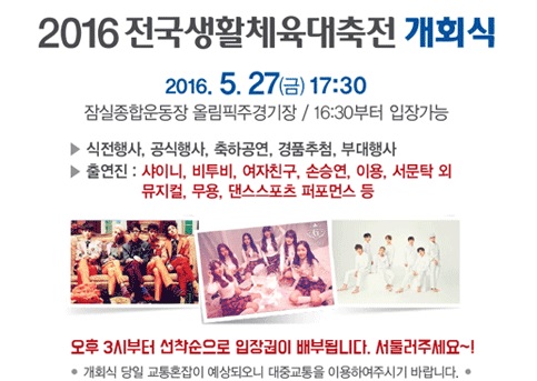韓国全土の社会体育グループが実力を競って親睦を深める 「2016全国生活体育大祭典」を間近に控え、 5月27日、チャムシル総合運動場オリンピック主競技場で開かれる開幕式に MCのカン・ホドンをはじめ、SHNee、BtoB、GFRIEND等の 有名アーティストが大挙出演を発表。 祭りのボルテージが一気にUPするであろう。 《2016全国生活体育大祭典(전국 생활체육대축전)》 【開会式日時】2016 年 5 月 27 日 (金)午後05:30~午後08:30 【会場】チャムシル総合運動場オリンピック主競技場 ※入場無料です。 ※入場は同日午後3時より先着順で入場券を配布。午後4時30分より入場可能。 ★弊社では当件に関しましては『情報』としてご案内をしております。 詳細は弊社では分りかねますので、主催者等にご確認下さい。 (弊社ではツアー等の商品設定はございません)