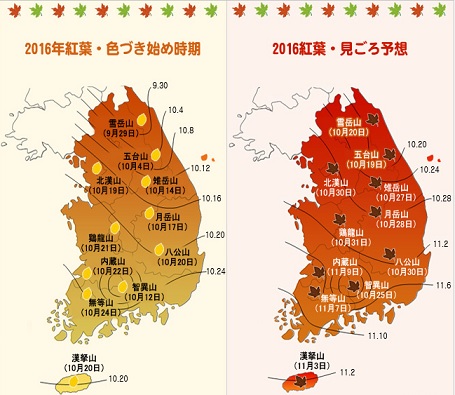 2016年の紅葉は平年より2日遅い9月29日に色づき始めると予想しています。 2016年の色づき始めは、雪岳山国立公園(内雪岳)の9月29日(木)を皮切りに、 中部地方は9月29日(木)~10月21日(金)頃、智異山国立公園(智異山老姑壇) を含む南部地方では10月12日(水)~24日(月)頃と予想されています。 見ごろは、色づき始めから約2週後で、雉岳山が10月27日(木)、 内蔵山が11月9日(水)と予想されています。 *ソウル郊外の北漢山国立公園は、10月19日(水)に色づき始め、 10月30日(日)が見ごろと予想されています。