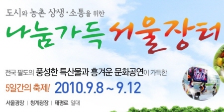 農村の活性と、都市との共存を図る、地方の特産物フェスティバルが ソウル広場、清渓(チョンゲ)広場、太平路一帯で行われます。 フェスティバルには全国11の特別市と道、136の市、郡が参加して 行われる大規模なもので、各地の農村特産物の広報や販売や記念行事、 音楽会などのイベントが行われます。 フェスティバルは午後2時から9時ごろまで各会場で行われます。