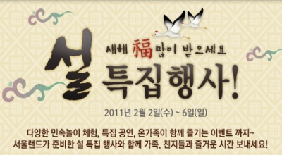 今年の旧正月(ソルラル)連休は週末を合わせれば最大5日間と 比較的余裕を持って余暇を楽しむことができます。 旧正月に併せソウル郊外にあるテーマパーク「ソウルランド」では ソルラルイベント「新年を迎えるフェスティバル」が開催されます。 連休期間中、ソウルランド内の広場では伝統民俗遊びや ソウルランドキャラクター総出演の伝統公演、観客が参加できる 公演ショーなど様々なイベントが行われます。 また新年を迎えうさぎ年の人を対象とした割引イベントも行われ 学生も通常料金から1万ウォン割引された自由利用券が販売されます。 更に外国人を対象に1月29日から2月6日まで自由利用券が 1万ウォンで購入することができます。