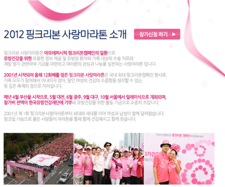 今年で12回目となる「ピンクリボン愛のマラソン」が10月ソウルで開催されます。乳がん撲滅運動と乳がん患者と家族を対象とした手術費用と再発防止に発生する費用基金の為、毎年4月釜山で幕開けし、5月大田(デジョン)、6月光州(クァンジュ)、9月に大邱(テグ)、そして10月ソウルとリレー式に開催され、参加費全額は韓国乳房健康財団に寄付されます。ソウルのマラソンコースは、汝矣島(ヨイド)公園周辺の5kmコースと10kmコースで記念品にはLecaf機能T-shirtが貰えます。寄付もでき、健康に良し、秋のソウル、汝矣島(ヨイド)を感じることのできるマラソン大会は一石三鳥です。 <日程・場所> ソウル大会 2012年10月7日(日) 汝矣島(ヨイド)公園文化の広場 受付人数:10,000名(先着順) <時間> 各地域8:30集合、9:30出発 <参加部門> 希望(ヒマン)コース10km (自動記録計測着用((net time)) ) 健康(コンガン)コース5km (記録未計測) <記念品> Lecaf機能性T-shirt <主催> アモーレパシフィック、韓国乳房健康財団 <参加費> 10,000ウォン ※参加費は全額韓国乳房健康財団に寄付されます。 <詳細・参加申請> http://blog.naver.com/pinknme(インターネット申請・韓国語) ※現地での事情により現在とは記事の内容が異なる可能性がありますのでご了承下さい。