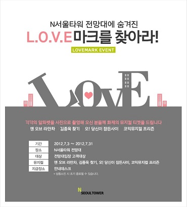ソウルのランドマーク、Nソウルタワーで”L.O.V.E”マークを探すイベントが9/7~9/20まで開催されます。Nソウルタワーの展望台に隠されている”L.O.V.E”マークを探して写真で撮ってNソウルタワーの案内デスクに提示すると今話題のミュージカルチケットが貰えます。是非あなたも参加してみてください。