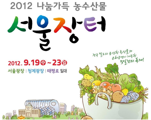 9月19日~23日の5日間ソウル広場、清渓(チョンゲ)広場、太平路(テピョンロ)一帯で「2012ソウル市場」が期間限定オープンします。韓国全国13ヶ所、144の市と郡における2000余りの豊富な農村特産物販売だけでなく文化公演など多彩なイベントが開催されます。ソウルにいながら他都市の特産が購入できる滅多にないチャンスですよ。