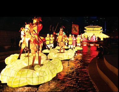 The time is year B.C. 18. 温祚大王が華やかな新国の歴史を夢見て負兒岳(北漢山)に登り、 その一帯を都と定め…やがて漢江にそって肥沃な平野の広がる漢城の地、 風納土城から 勇猛な百済の700年の歴史が始まる。 百済の31人の王は帝国の復興を願い高句麗の平壌城へ進撃し百済の威容を誇る一方で、 百済に攻撃する新羅・唐連合軍に立ち向かい、 黄山の戦いでは百済は最後まで決死の抗戦を続けた。 激しい戦争や2度にわたる遷都を経て優雅で洗練された文化先進国に発展した百済の文化は、 中国や日本を越え東南アジアにまで及び、百済は海上シルクロードを切り開く海洋大国となっていった。 時代の先を行く百済の偉大な文化は百済の人々に独創的で豊かな暮らしを与え、 今では百済の物語は美しく神秘的な説話となって語り継がれている。 古代百済から朝鮮、そして韓国へと続いてきた朝鮮半島の歴史の都、ソウル! ここで2013年、色あせていた百済の歴史が美しい光の絵に生まれ変わる。 ◆2013ソウル灯祭り◆ ・期間:2013年11月1日(金)~11月17日(日)・17日間 ・点灯時間:午後5時~午後11時 ・場所:ソウル清渓川一帯1キロ区間(清渓広場~三一橋)、ハンビッ広場 ・テーマ:漢城百済の千年の夢