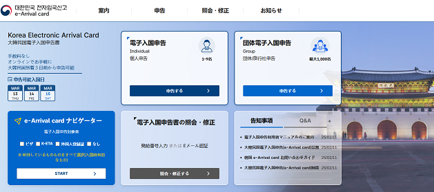 韓国政府は2月24日より、外国人渡航者向けの新たな電子入国申告制度〈e-Arrival card〉 の導入を開始しました。 この制度は従来の紙の入国カードに代わり、韓国入国前にパスポート情報や滞在先、連絡先 などの必要事項をオンライン上で事前申告できるシステムです。 電子入国申告〈e-Arrival card〉公式ホームページから、韓国入国予定日を含めて 3日間前より申告できます。申請フォームは日本語にも対応しており、 申告手数料は必要ありません。ただし、申告後72時間以内に韓国へ入国しない場合は 無効となるため注意が必要です。満14歳未満の未成年者が手続きを行う際は、 家族など代理人による申告が求められます。 〈e-Arrival card〉の導入は空港での入国審査の迅速化が図られ待ち時間が短縮されるほか、 パスポート情報の確認や審査がスムーズになることが期待されています。 一方、オンライン上での操作に不慣れな高齢者の方、システム障害やインターネット接続に 問題が生じた場合など入国審査に混乱が生じるという懸念も考えられています。 そのため韓国政府は、2025年12月まで紙の入国カードとの併用を続ける方針です。 【韓国/電子入国申告〈e-Arrival card〉公式ホームページURL(日本語)】 https://www.e-arrivalcard.go.kr/portal/main/index.do?locale=JP