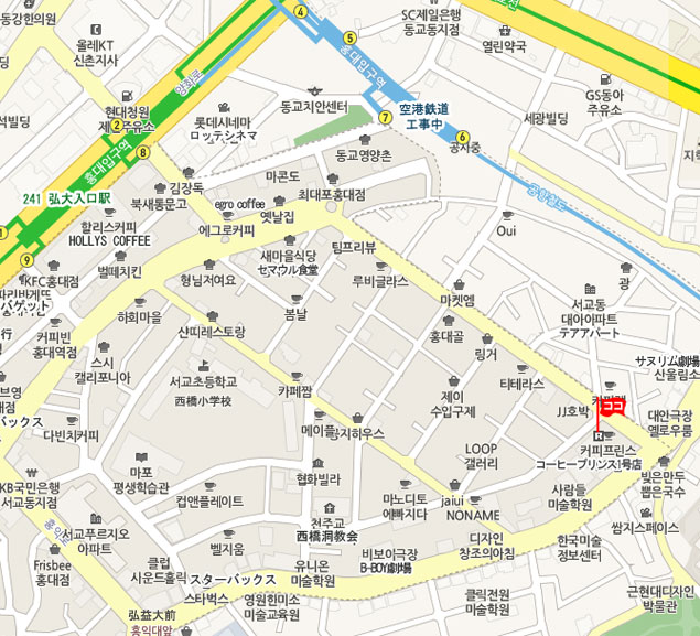 現地 アクセス  地下鉄2号線弘大入口(ホンデイック、Hongik Univ.)駅4番出口 徒歩10分