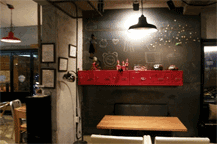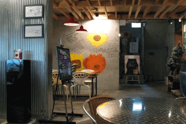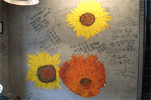 店内は「コーヒープリンス1号店」の世界がそのまま残り、壁や店内のいたるところにサインやメッセージが残されています。ユジュが描いたひまわりの花はカウンター横のコンクリートの壁にあって、その前のテーブル席が特に人気があるそうです。 日本を始めアジア各国から団体ツアー客も訪れますので、ゆっくりするなら週末を避けて平日の午後早い時間がお勧め。