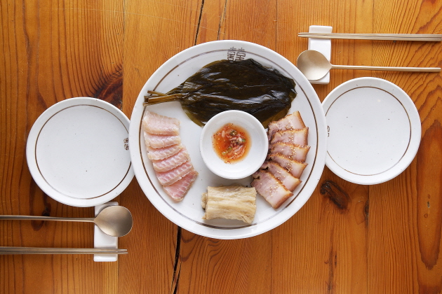 料理はコースにより異なります。 三合は蒸した豚肉とエイをキムチに包んで頂く珍味。