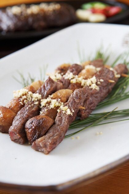 韓牛 トクプルゴギ ワタリ蟹の醤油漬け 松茸と謬肉の串焼き ジョンの盛り合わせ