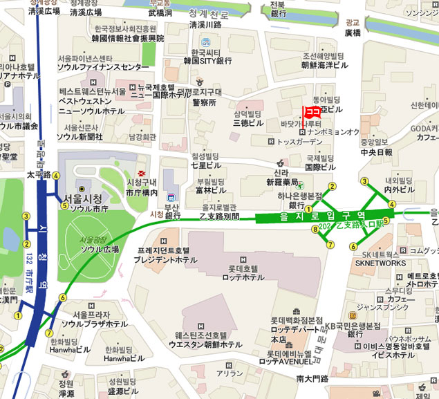 現地 アクセス       地下鉄2号線 No. 202 ウルチロイック(乙支路入口・Euljiro 1(il)-ga)駅1番出口から 徒歩約5分