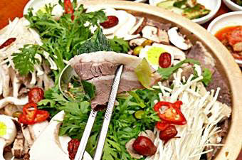 チェンバンは牛の胸部分の肉と、牛の乳房の部分のお肉がメインになった珍しい料理です。このお肉や野菜や茸類、ナツメ等を胸肉でとったスープで煮込みます。 お肉や野菜が煮込まれたら鍋の真ん中に置かれたソースにつけていただきます。追加料金でお餅やマンドゥ(餃子)も加えることができます。