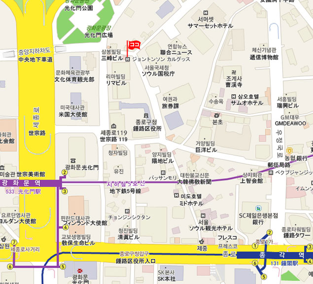 現地 アクセス  地下鉄5号線 光化門 (クァンファムン、Guanghwamun)駅2番出口 徒歩10分