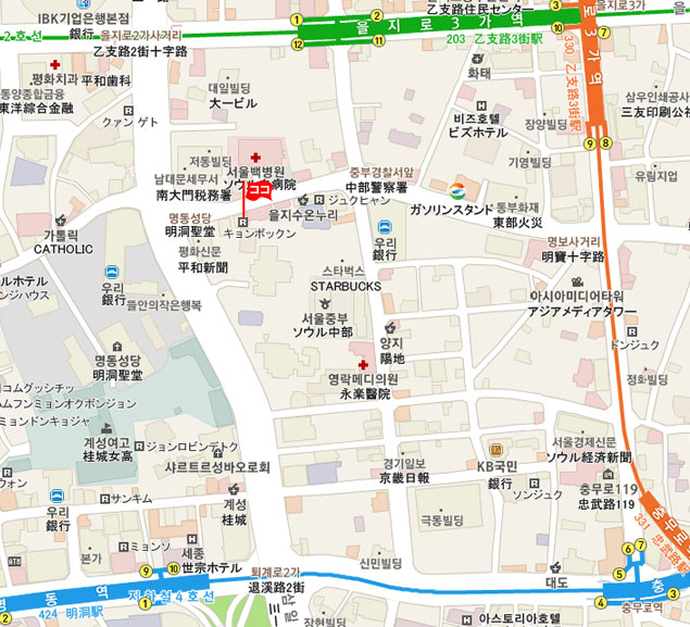 現地 アクセス  地下鉄4号線明洞(ミョンドン、Myeongdong)駅10番出口 徒歩7分/6番出口 徒歩9分