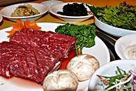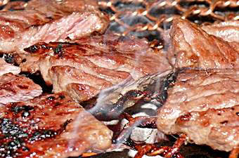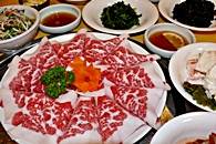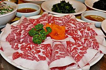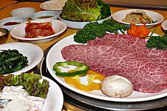味付けカルビ、プルコギ、豚の5枚肉、牛舌(たん)、冷麺など