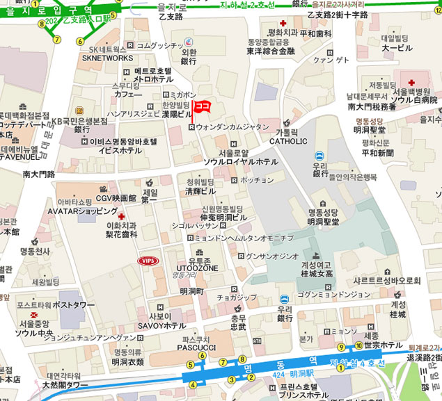 現地 アクセス  地下鉄2号線ウルチロイック(乙支路入口・Euljiro1(il)-ga・202)駅の5番.6番出口の間にある地上に上がる出口から
