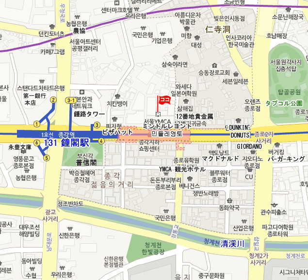 現地 アクセス  地下鉄1号線鐘閣(チョンガッ、Jonggak)駅番出口から徒歩約5分