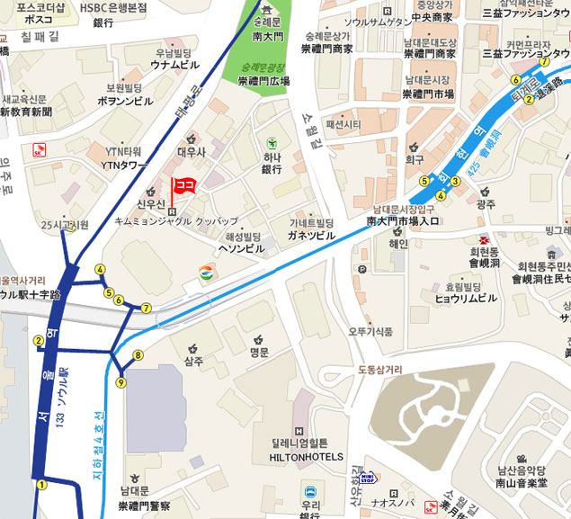現地 アクセス  地下鉄1・4号線ソウル駅(Seoul Stasion・133/426)4番出口から徒歩約5分