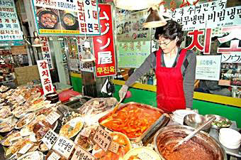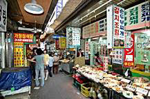 南大門市場は外国からの観光客の観光スポットとして、明洞や東大門市場と並び人気の場所。この南大門市場で何か食べたいというとき、この「ムジンノック」がお薦めです。日本のマスコミやガイドブックにも何度も登場しているこのお店なら、安くて美味しいものが食べられます。店の入口にも、料理のサンプルがズラッと並べてあるので韓国語が分からなくても大丈夫。店のアジュマたちも、簡単な日本語ならOKなので、注文には困りません。明洞や梨秦院の観光客用の食堂に飽きた人は、ぜひこんな市場の食堂で地元の味を楽しんでください。