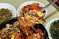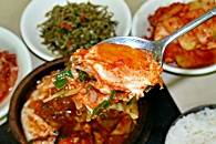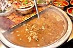 メニューは全部で20種類ほど。この中で、いくつかお薦めのものを紹介しましょう。まず、チェユクトッパッ。これは豚肉のコチュジャン炒めをご飯の上の載せたもの。日本で言えば、豚丼のようにポピュラーな料理です。ちょっと辛めですが、ご飯に混ぜながら食べれば大丈夫。つぎにユッケジャン。これも辛い料理。牛肉と野菜や山菜を一緒に煮込んだものをご飯と一緒に食べます。韓国人にとって、ポピュラーな味の一つです。どの料理も日常、韓国人がいつでも食べるもの。せっかく南大門市場に来たのなら、一度はチャレンジしてみてください。