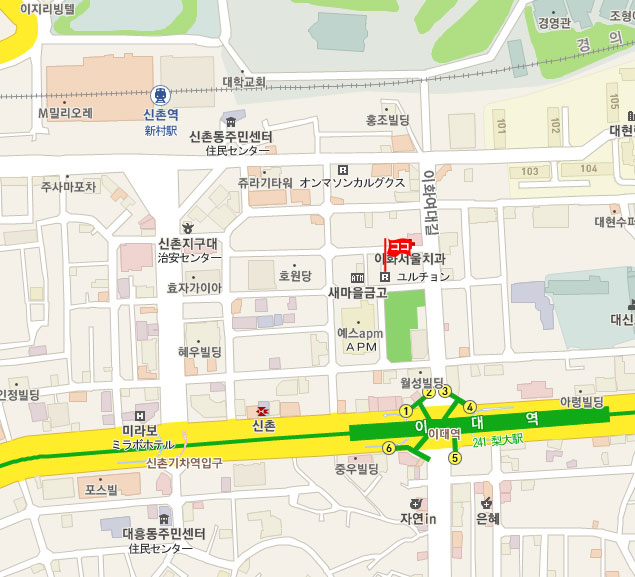現地 アクセス  地下鉄2号線イデ(梨大・Ewha Womans Univ.・241)駅3番出口から徒歩約7分