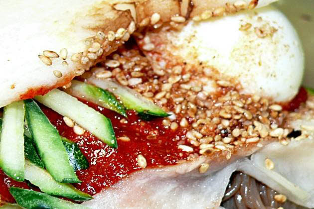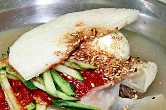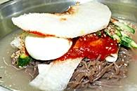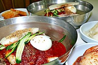 フェネンミョンのフェは刺身と言う意味。ただ、刺身といっても全くの生ではなく発酵させたホンオ(エイ)の身をいれた冷麺です。ムルネンミョンは日本でもお目にかかれる、一番ポピュラーな冷たいスープがある麺ですね。普通、ムルネンミョンのスープは肉のスープと水キムチの水をあわせたものといいます。ここのスープは他の店に比べてすっぱさのほうが目立っている。最後がビビンネンミョン。コチュジャンのソースを混ぜて食べますが、ちょっと辛めのメニュー。辛くて大変なときは、一緒に出てくるコップに入ったスープを飲んで一休みしましょう。冷麺というと焼肉のサイドメニューのような気がしますが、それは誤解。ソウル市内に、冷麺専門の店はたくさんあります。そんな店で、一度冷麺を食べてみてください。