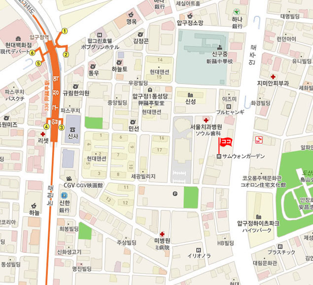 現地 アクセス  地下鉄3号線アックジョン(狎鴎亭・Apgujeong)駅3番出口から徒歩約10分