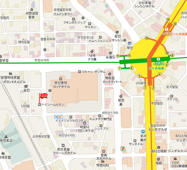 現地 アクセス  地下鉄1,2号線ソミョン(西面・Seomyeon)駅ロッテデパート地下入り口左横階段を上がって徒歩約3分