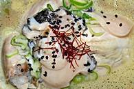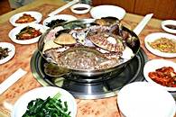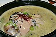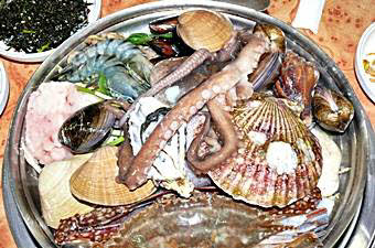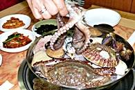 夜ともなると、今度はヘムルタンを注文するお客様でいっぱいになります。カニ、エビ、イカ、貝などの海産物がたっぷり入ったヘムルタンは思ったより、口当たりが爽やか。他の鍋料理と同じように、サイズは中(2~3人前)と大(3~4人前)に分かれていますので、グループでどうぞ。ヘムルタンと一緒に、パジョンを注文するお客も多くいます。また、ほかでは味わえないメニューがアワビのサムゲタン。ちょっと値段は張りますが、美味しさと栄養満点で、一度味わってください。というのも、この店の主人は、以前サムゲタン専門店を経営したことがあるとか。