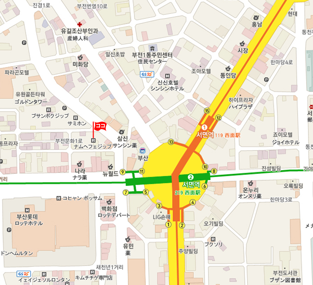 現地 アクセス  地下鉄1号線、2号線ソミョン(西面・Seomyeon)駅9番出口から徒歩約5分