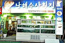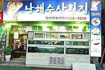 港町釜山には釜山沖で獲れた新鮮な魚介類を食べられる海鮮料理専門店がたくさんあります。刺身、ヘムルタン、へムルパジョン、アグチムなどいろいろな海鮮料理がありますが、その中で安心して刺身を食べられるお店が、この「ナムヘスサンフェチッ」です。釜山の繁華街、西面(ソミョン)交差点からクリニック通りを左手に見ながら進んでいくと、交差点から数分のところに、このお店があります。周りは食堂街ですが、刺身専門店には外に大型の水槽があるので直ぐに分かります。