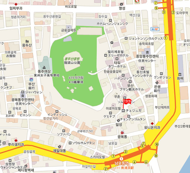 現地 アクセス  地下鉄1号線ナンポドン(南浦洞・Nampodong)駅5番出口から徒歩約7分。