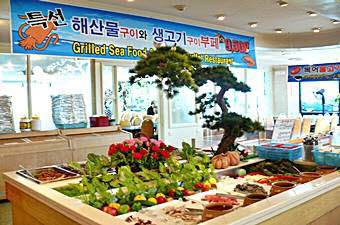 また、魚介類もマグロやタコの刺身や、イカやナクチのプルコギも楽しめます。そのほかに、フライ類、ジョン、チャプチェ、スブタ、キムチ、ナムル、韓国式海苔巻き、おすし、お餅、アイスクリームなど、50種類以上のメニューがあります。このビュッフェレストランはチャガルチ市場の中の建物、6~7階にあり、窓側の席からは、釜山港が手にとるように見えます。昼間の活気に満ちた釜山港や、夜には夜景を見ながらお食事をどうぞ。