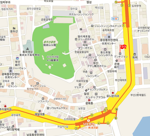 現地 アクセス          地下鉄1号線のNo.111 南浦洞(ナンポドン ・Nampodong)駅 5番出口を出て、徒歩約5分。