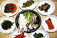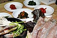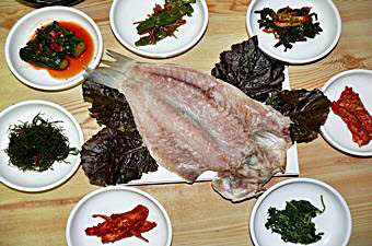 海鮮料理専門店の「金五亭」は釜山にいながら、済州島の新鮮な海産物を味わえるお店としてしられているお店。釜山の味とはまた違った楽しみがあります。済州島といえば、韓国最大の島で豊富な漁場に恵まれ、特に太刀魚(タチウオ)が有名。金五亭では太刀魚の塩焼き、わかめと太刀魚のスープ、太刀魚の煮込みなど、太刀魚の魅力をたっぷり楽しめるようになっています。また海の幸がぎっしりつまった、へムルトッペギ(海鮮物の味噌汁)も一口飲めば海の香りが広がる名物料理です。これにアマダイの干物をつければ最高です。