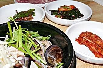 お店の人気メニュー、サバの一夜干焼き。済州で捕れた直後に内臓を取り除き、そのまま海水に漬けお店に届けられたもの。サバの新鮮さを損なわれることなく潮の香りが一杯に広がります。 魚介類がたっぷり入ったヘムルトゥッペギ。よく効いたダシとほのかな味噌味がよく合い、さっぱりとした味の一品です。