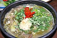 慶尚道の名物料理の一つにドジョウを使ったチュオタンがあります。チュオタンというと全羅道の南原(ナムウォン)のチュオタンが有名ですが、慶尚道のチュオタンもそれに負けないほど人気があります。ただミキサーでドジョウをつぶしてしまう全羅道式の作り方ではなく、慶尚道ではドジョウを湯がいた後、丁寧に頭と骨をとり、野菜と一緒に煮込んで味噌で仕上げてあり、あっさりタイプの味となっています。また、フグをつかったポックッ(フグ鍋)も評判です。こちらは唐辛子を使っていないので、辛くありません。辛いものが続いて、少し辛いときこんな料理で一休みしましょう。
