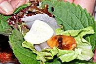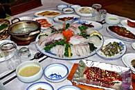 フェ(刺身)を注文すると、最初に付きだしが並び、次にメインの刺身、最後のしめにメウンタン(魚のアラのスープ)が出てきます。まず、付きだしの種類の多さと量が半端ではありません。サラダや天ぷら、焼き魚、貝のスープ、おすし、ジョン、煮付けなど、テーブル一杯に小皿が並びます。次にメインのお刺身。生け簀の中の魚をその場で下ろして出してくれます。韓国では白身魚を主に刺身で食べますが、プリプリした歯ごたえはマグロとはまた違った美味しさです。韓国ではサンチュなど葉野菜にコチュジャンやサムジャン(薬味入り味噌)と一緒に刺身を包んでも頂きます。お刺身を十分に堪能した後はメウンタンでご飯をどうぞ!