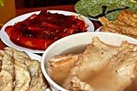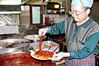 よくある真っ赤なソースと違い、こちらの赤茶色がかったソースはご主人が研究を重ねた自家製ソース。ベースになるコチュジャン(唐辛子味噌)が重要なポイントだとか。 午前中にしっかり仕込みをするために午後からの営業になるんだそうです。サイドメニューの天ぷらや餃子もこのソースによく合います。