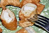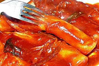トッポッキと一緒にティキム(天ぷら)やマンドゥ(揚げ餃子)、おでんもお試しください。 イカの足がつまってます。ティキムやマンドゥをトッポッキのソースに絡めて食べても美味。