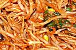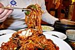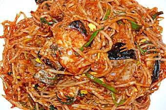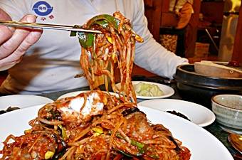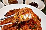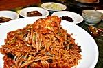 アンコウとたっぷりの豆もやしと野菜を炒め蒸しにした料理でアンコウのプリッとした食感とかなり辛く炒め蒸しされたモヤシがよく合います。 アグチムは辛い物に慣れている韓国の人にも「辛い」と言わせてしまう激辛料理。辛いアグチムにはソジュ(焼酎)やドンドン酒(伝統酒)がよく合いますので、ご一緒にどうぞ。