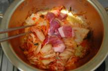 ◇鍋に油を引き、焦げないように火加減に注意しながらキムチと豚肉を炒める