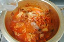 ◇キムチスープが沸騰したら野菜を加え、更にソーセージ、ハム類、豆腐を加えて煮込んでいく。塩などで味を調え、味が薄いようならキムチの汁などを加えていく