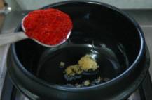 ◇小さめの鍋にごま油を引き、ニンニクと唐辛子の粉を加え炒める。
