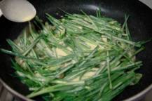 ◇熱したフライパンに油を引き、ニラを加えたタネを落とし焼いていく。ニラの間に隙間があったらタネをスプーンで落とし隙間をふさいでニラの上に唐辛子をのせる。