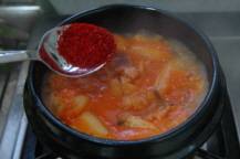 ◇鍋に水とダシを加え煮立ってきたら唐辛子の粉を加え、塩で味を調え最後に豆腐を加える