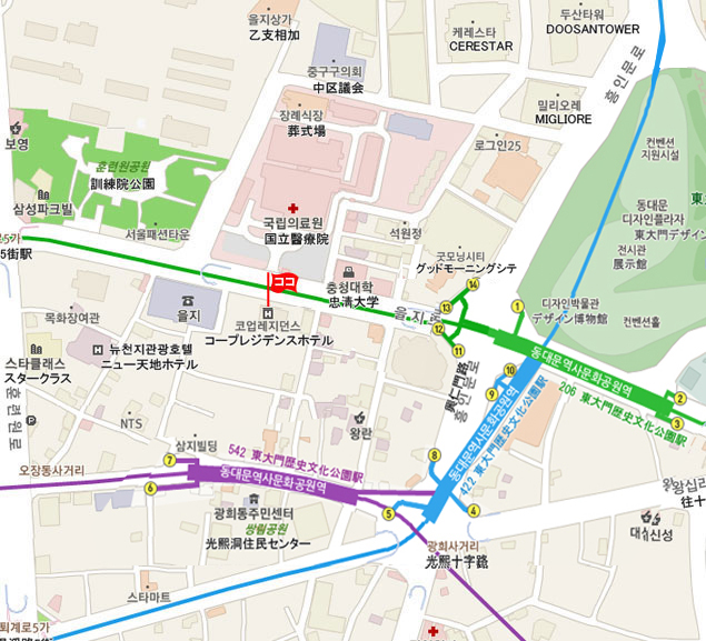 ♣ 仁川空港 ⇒ ホテル アクセス • 高級リムジンバス : バス乗場:《第1T》5B 《第2T》29 運行間隔20~25分 所要時間 約83分 6001番(ソウル駅方面)バスに乗り、イーストゲートタワーホテル.コープレジデンス乙支路にて下車。 • タクシー : 所要時間 : 73分 ♣ 金浦空港 ⇒ ホテル アクセス • 地下鉄 : 金浦空港 (Gimpo Int’l Airport)から地下鉄5号線に乗車し、東大門歴史文化公園(Dongdaemun History&Culcure Park)駅にて下車。 12番出口徒歩約3分。 • タクシー : 所要時間 : 約41分 ♣ その他 情報 • チェックイン 14:00、 チェックアウト 12:00 • NHKなど衛星放送 受信可。 • Wi-Fi( 全客室有、無料、パスワード無し)、有線LAN接続(全客室有、無料) • 徒歩 2分以内にコンビニあります。 • 現地の事情により予告なしに変更される場合もございます。あらかじめご了承ください。 • 予約の確認、変更依頼、取消はMy予約確認ページにて行えます。 • メール送受信状況の確認、お客様とハナビツアーとのメッセージのやりとりはMy予約確認ページ ⇒ メール送受信 にて行えます。 • 最終更新日 : 2020. 02.10